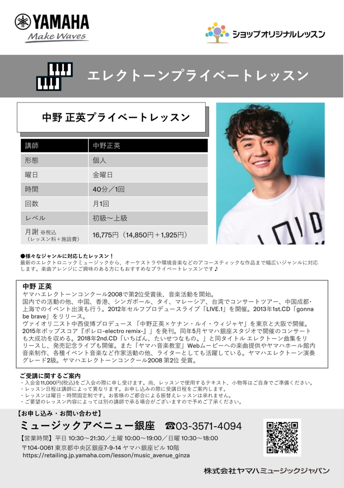 ヤマハ銀座店10階「ミュージックアベニュー銀座」にて開講中の中野正英エレクトーン・プライベートレッスンに、新たに80分コースが加わりました。