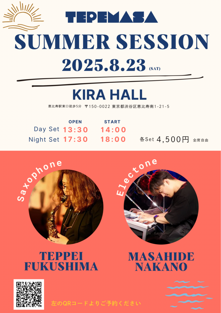 《東京》TEPEMASA -Summer Session 2025- SCHEDULE 2025/08/23(土) 恵比寿KIRAホール(JR恵比寿駅東口より徒歩5分) 地図を表示 【料金】¥4,500(現地払い・現金のみ) 【Day Set】 開場 13:30 / 開演 14:00(終演予定 16:00) 【Night Set】 開場 17:30 / 開演 18:00(終演予定 20:00) 【出演】Sax:福島哲平 El / Pf:中野正英 予約フォーム URLをコピーする 報告する